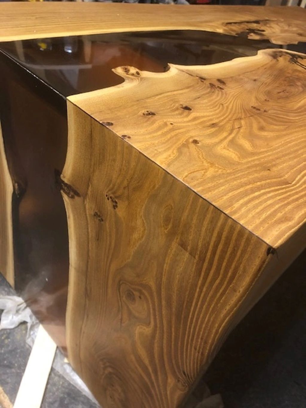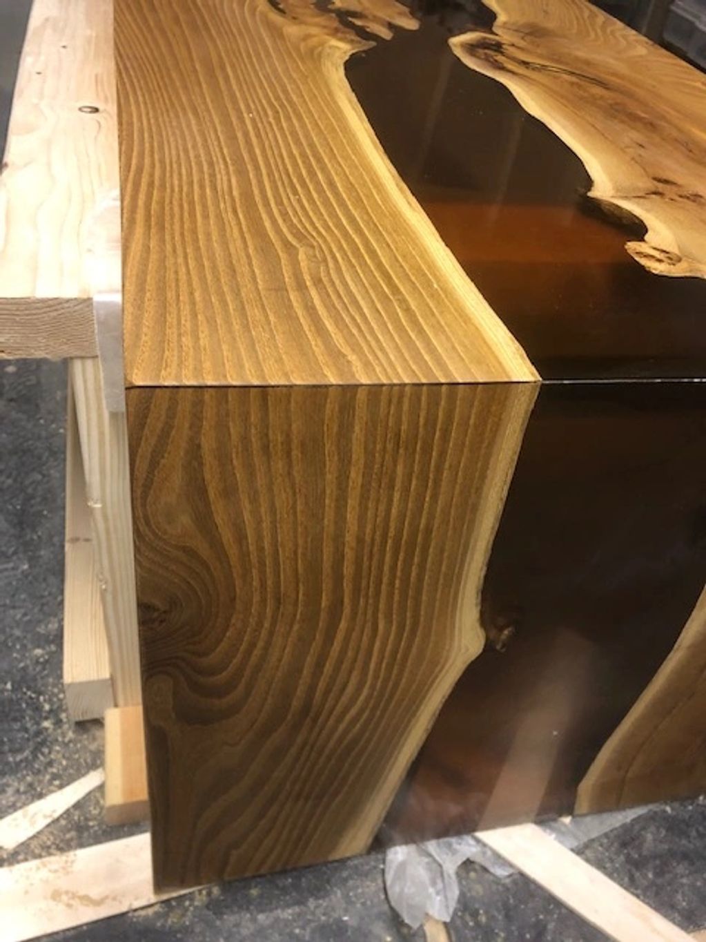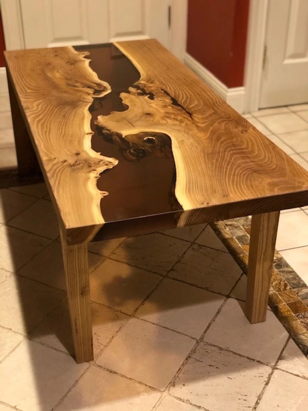 English Elm Waterfall Coffee Table with Caramel transparent epoxy. Ash Hepplewhite legs. $1,700 SOLD