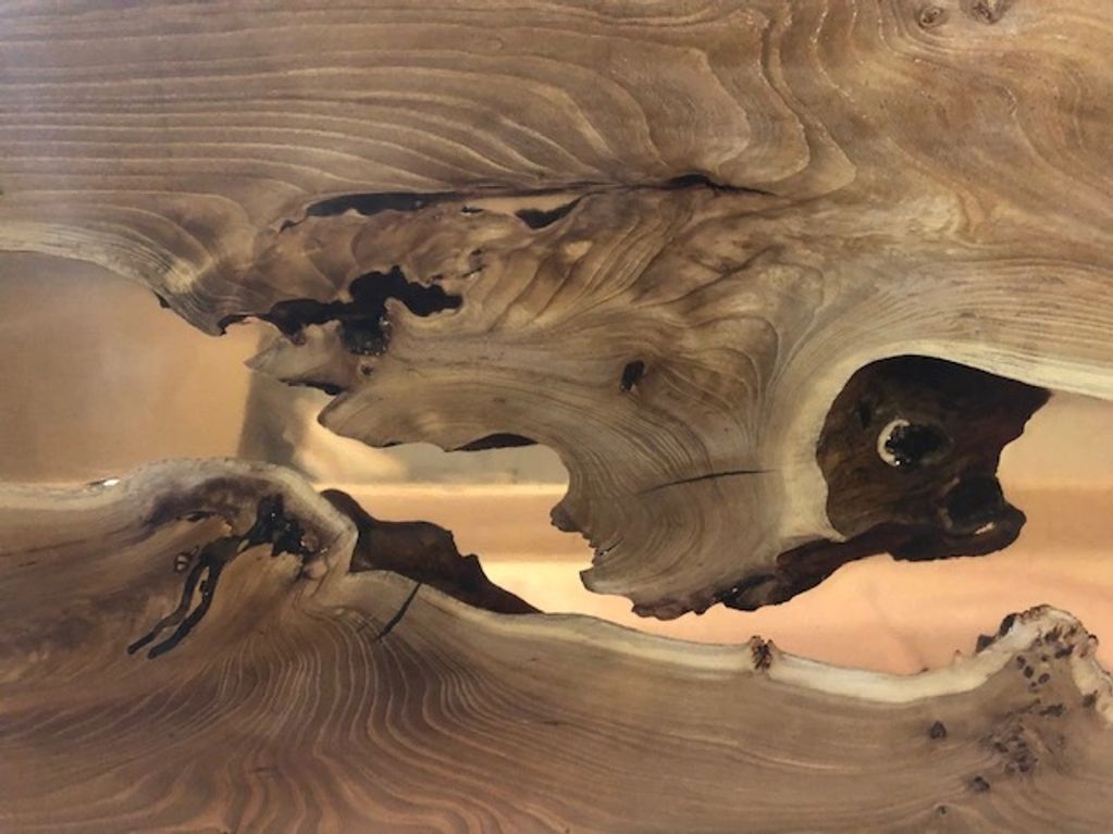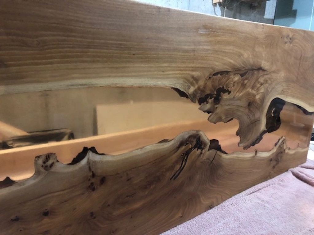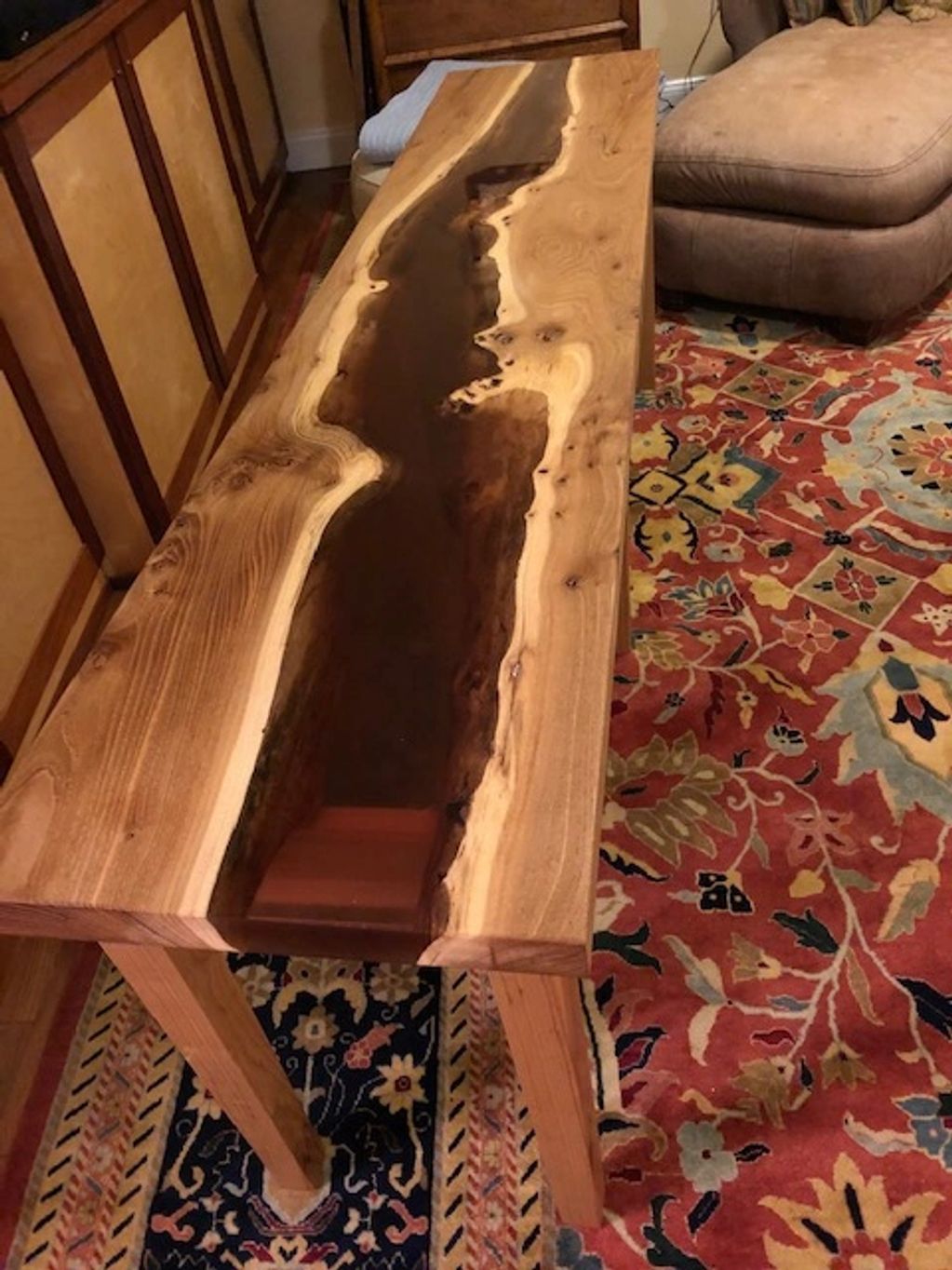 English Elm Waterfall Coffee Table with Caramel transparent epoxy. Ash Hepplewhite legs. $1,700 SOLD